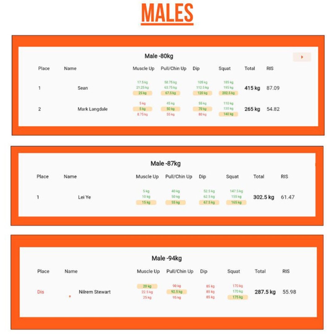 Good to know: Bodystrong is a weighted streetlifting competition consisting of 4 lifts: muscle up, pull up, dip and squat. Athletes have 3 attempts at each lift to build the biggest overall total. The competition is split into male and female, and then into weight categories.